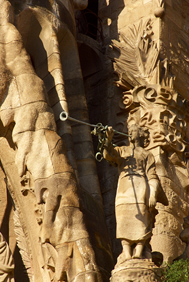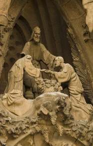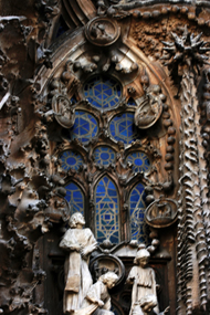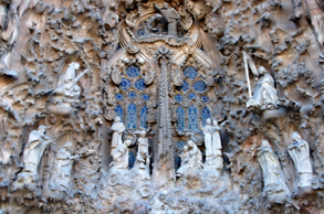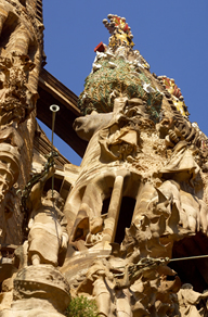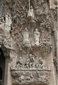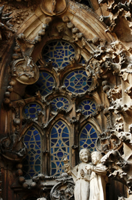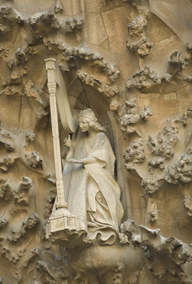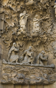 Completed in 1930, The Sagrada Familia Nativity Facade is the only part of the Cathedral that was finished in Gaudi's lifetime. The Nativity Facade celebrates the life of Jesus with scenes from his birth and childhood. Angels are featured playing musical instruments, heralding the "Triumph of Life."