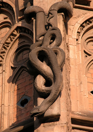 Find the Serpent - A snake eating an apple sits at the bottom of Jesus' genealogy column. It represents the serpent and the apple from the Garden of Eden, and man's fall from grace which is the reason for Jesus' birth.