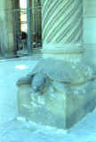 Find the Two Turtles at the base of the columns. The sea turtle with flippers is looking out to sea. The land tortoise with a paw is looking landward. The turtles symbolize permanence.